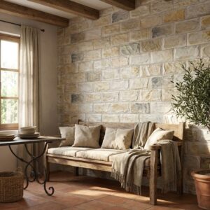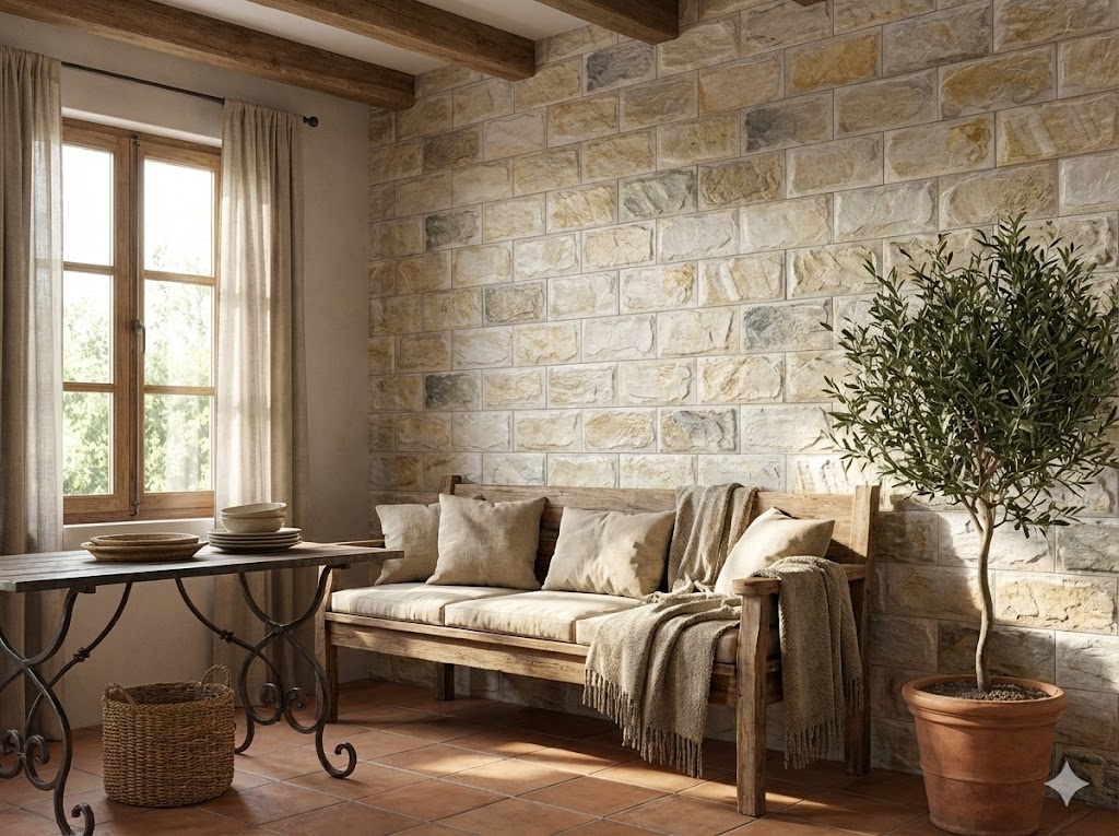 Tip: En paredes con mucha textura, combina con mobiliario de líneas limpias para equilibrar el conjunto.